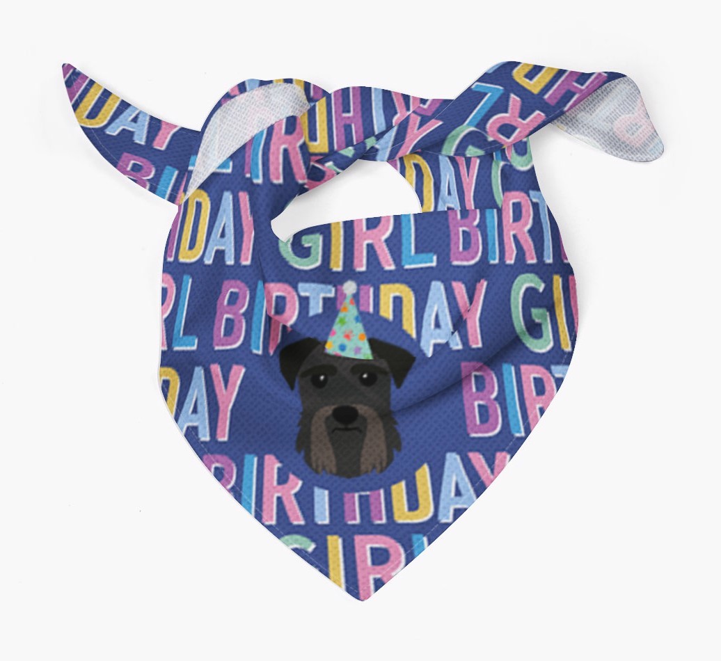 Featuring a text pattern that reads 'birthay girl' and personalized with Giant Schnauzer's cute icon (complete with a fun party hat), your Schnauzer will look simply pawgeous on their special day when they're wearing this bandana.