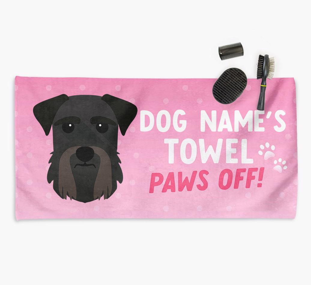 Perfect for messy pups and for pampering your Schnauzer at bathtime, this soft and absorbent towel is made for cleaning your mucky pup and drying them off in a flash. It's personalized with Giant Schnauzer's name and icon and is printed with a message for everyone else to keep their paws off it!