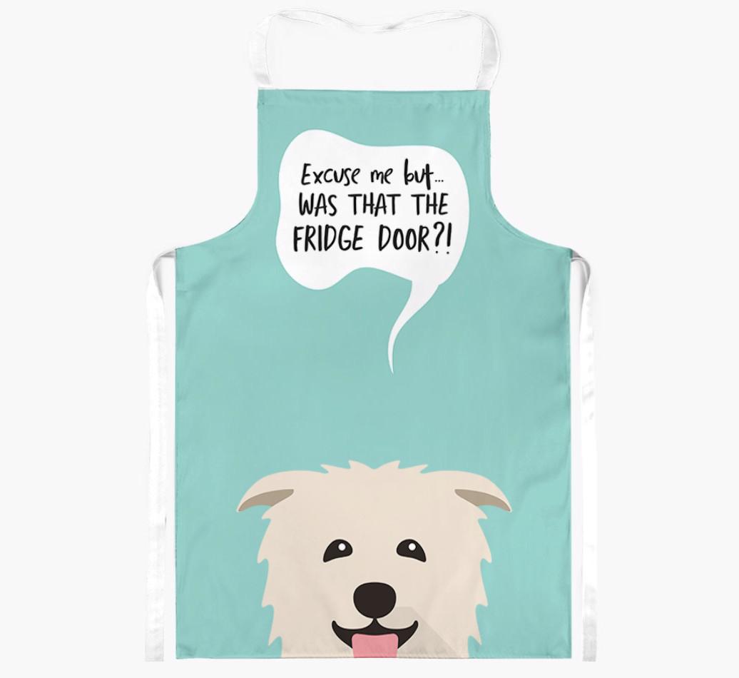 Featuring your hungry hound's cheeky icon and available in five eye-catching colors, this apron is a must-have for parents of greedy pups!