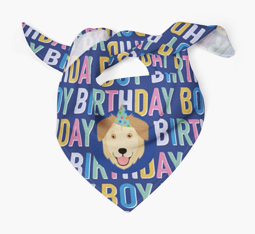 Featuring a colorful text pattern that reads 'birthay boy' and personalized with Goberian's cute icon (complete with a fun party hat), your Goberian will look simply pawgeous on their special day when they're wearing this bandana.