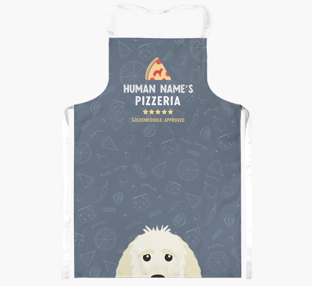 Featuring your furry friend's icon and lick of approval, plus your chosen human name, this apron is pawfect for anyone who considers themselves a pizza maestro in the kitchen. Available in a choice of 5 rustic colors, it'll make any Goldendoodle lover happy.