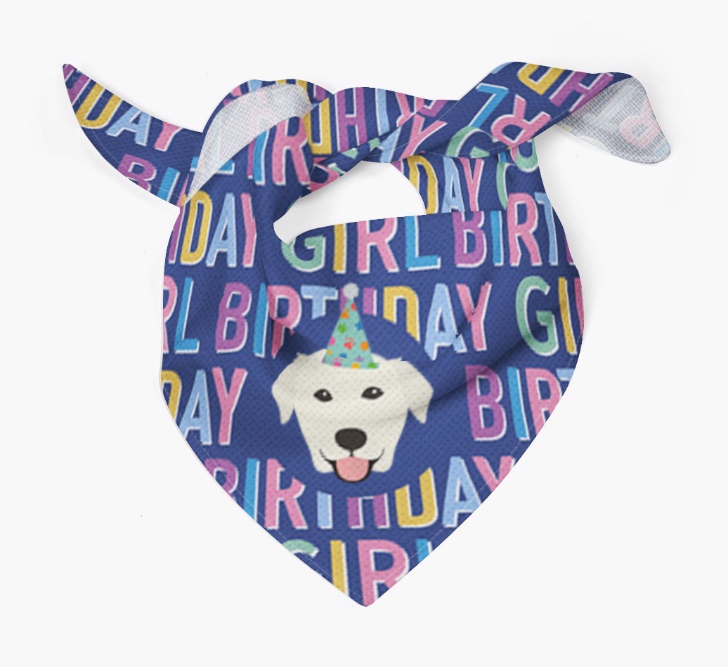 Featuring a text pattern that reads 'birthay girl' and personalized with Golden Labrador's cute icon (complete with a fun party hat), your Golden Lab will look simply pawgeous on their special day when they're wearing this bandana.