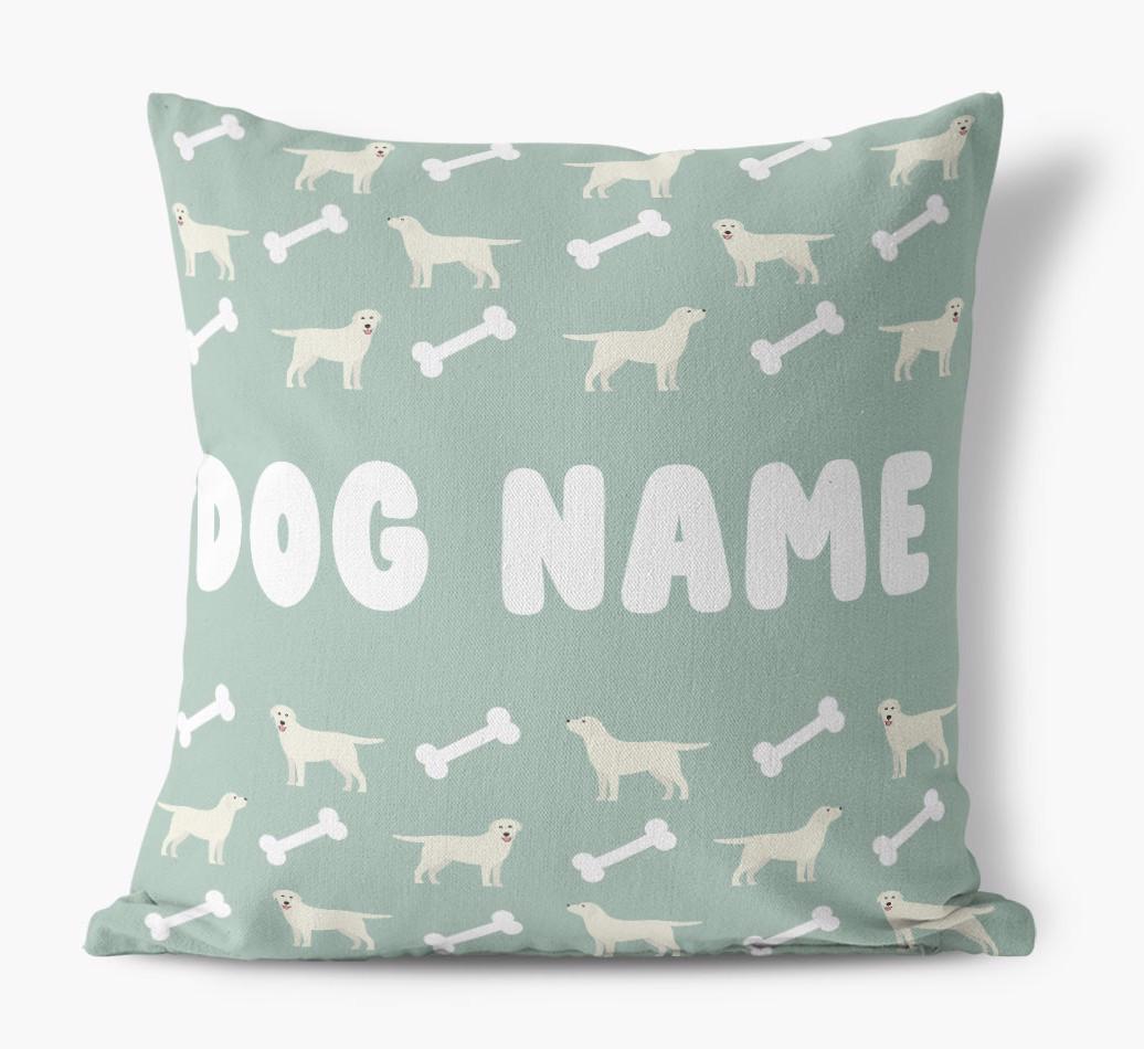 Personalized with Golden Labrador’s name against a background of Golden Lab icons and bones, this gorgeous pillow is full of pawsonality.