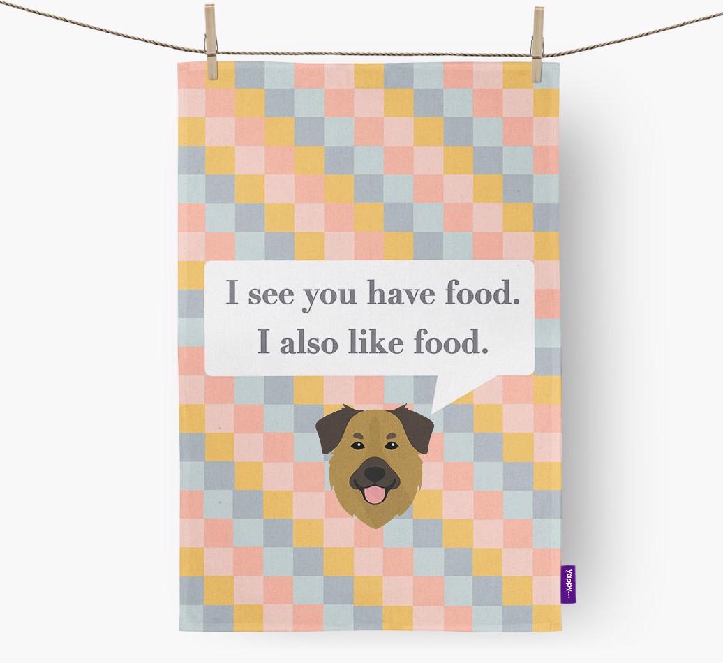 If your Golden Shepherd is a full time snack machine, this dish towel may be the ideal way to warn your guests.