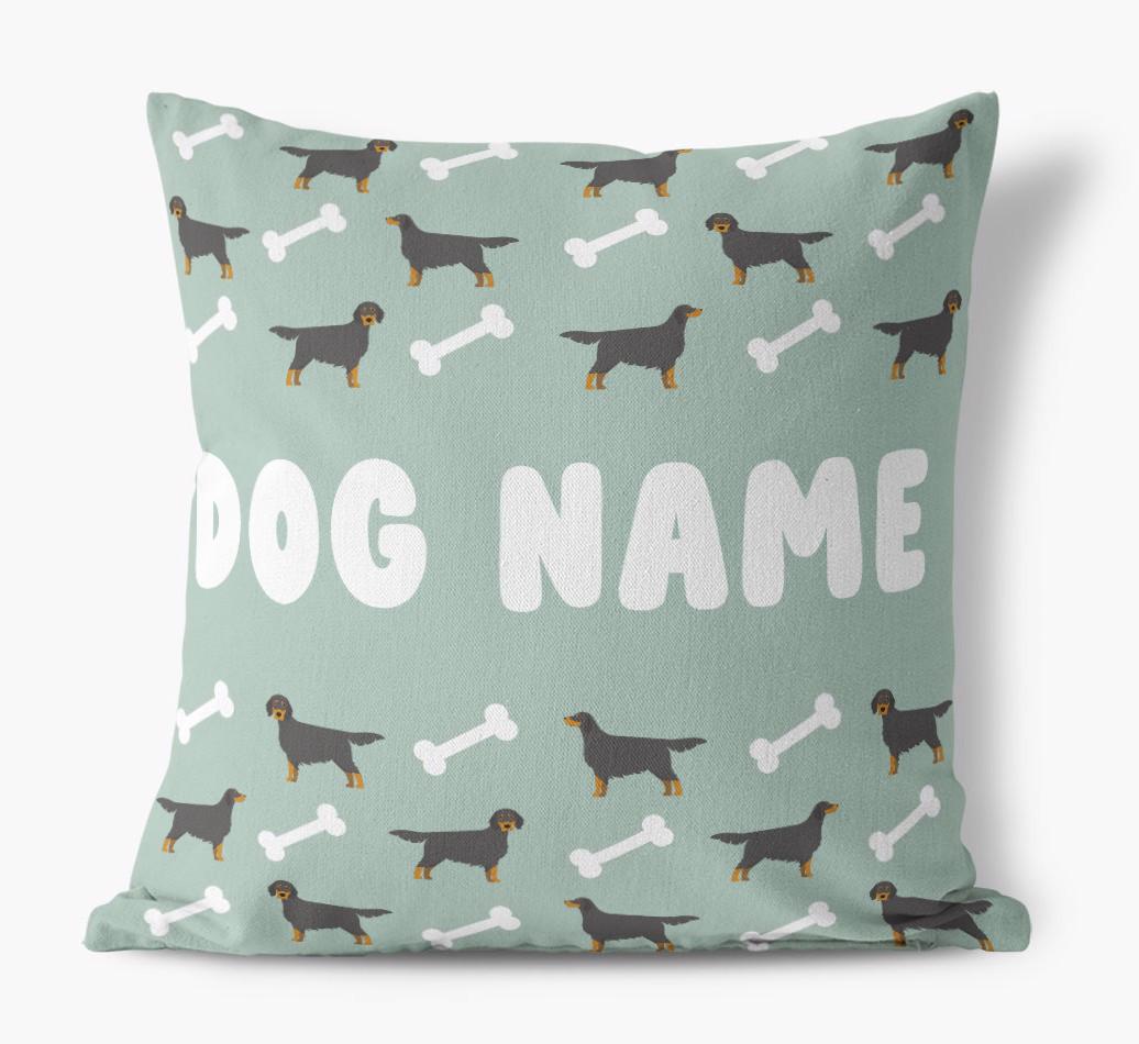 Personalized with Gordon Setter’s name against a background of Gordon Setter icons and bones, this gorgeous pillow is full of pawsonality.