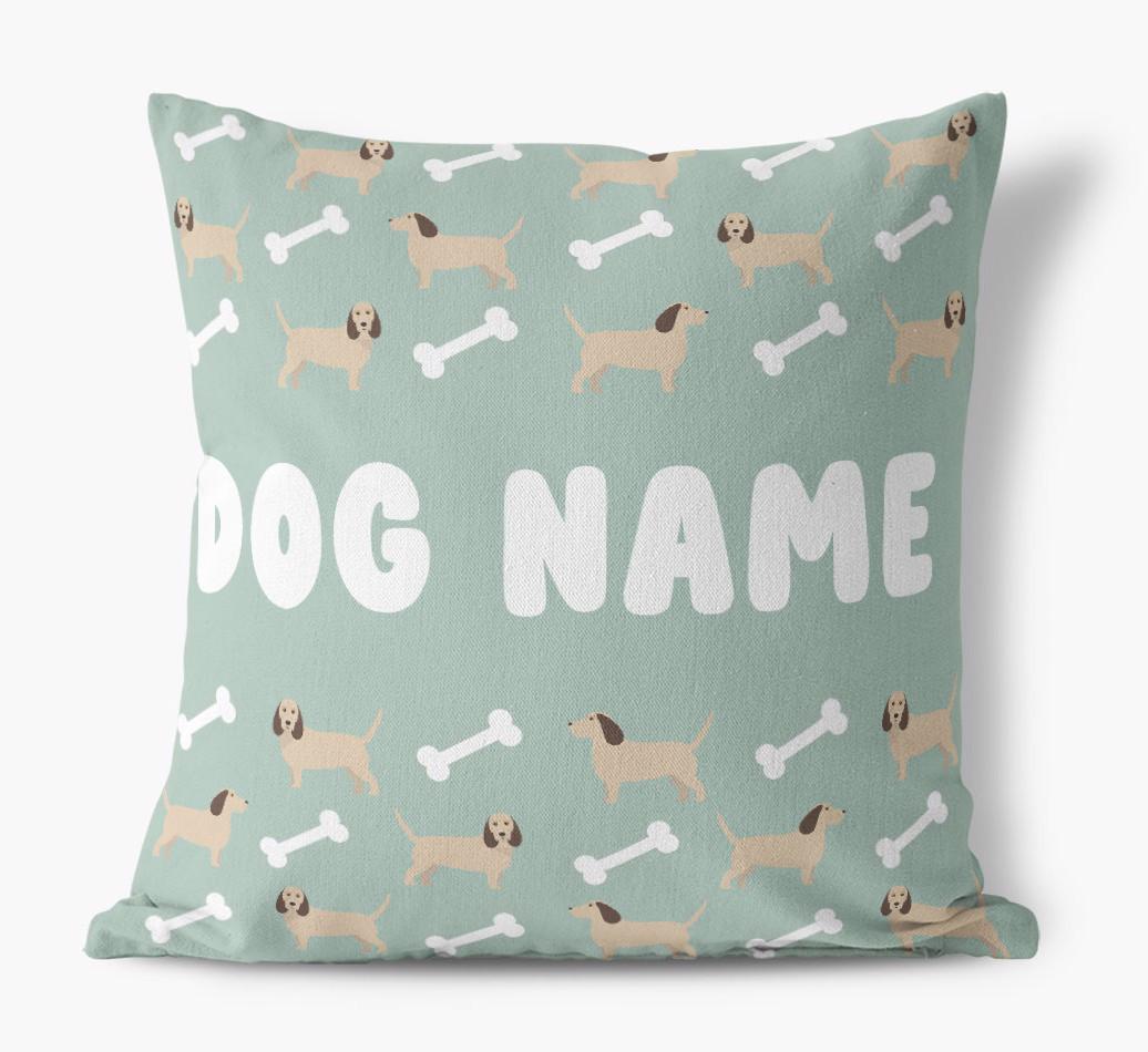 Personalized with Grand Basset Griffon Vendeen’s name against a background of Basset Griffon icons and bones, this gorgeous pillow is full of pawsonality.