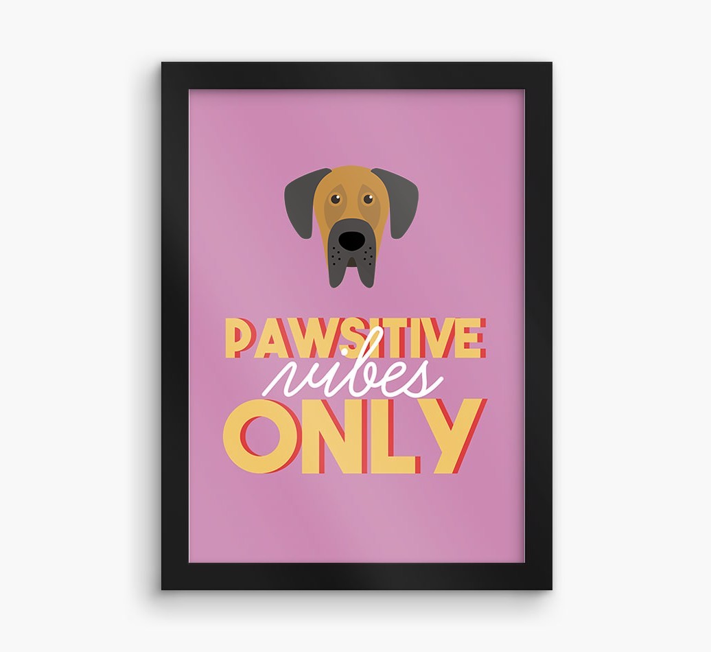 Featuring your Great Dane’s yappicon and vibrant text that says 'pawsitive vibes only', this print is pawfect for adding a burst of color and plenty of good vibes into your home (with a helping paw from Great Dane).