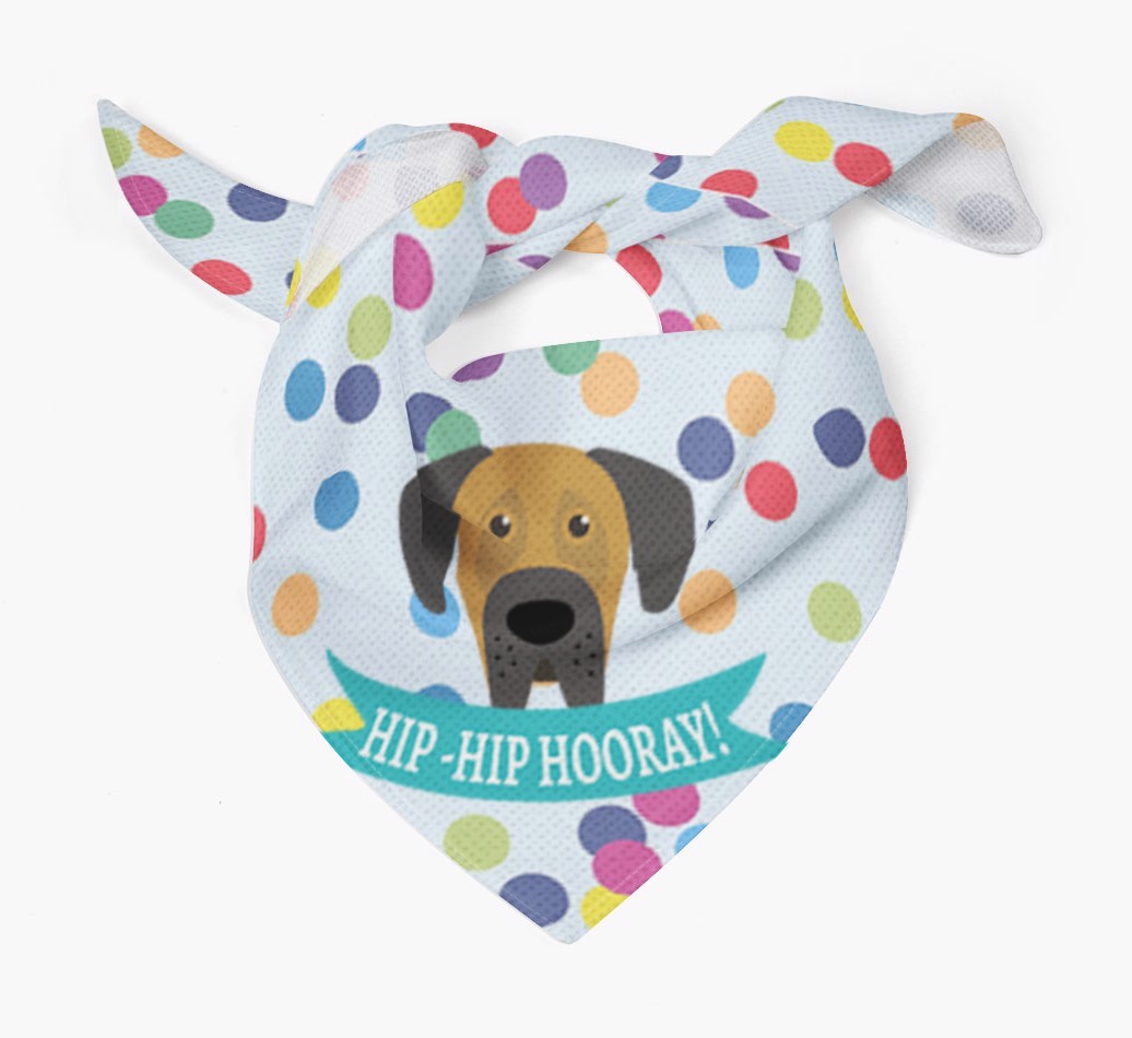 Featuring our famous Great Dane icon and the words ‘hip-hip hooray!’ printed upon a colorful confetti background, Your Great Dane is sure to look pawty ready wearing this bandana.