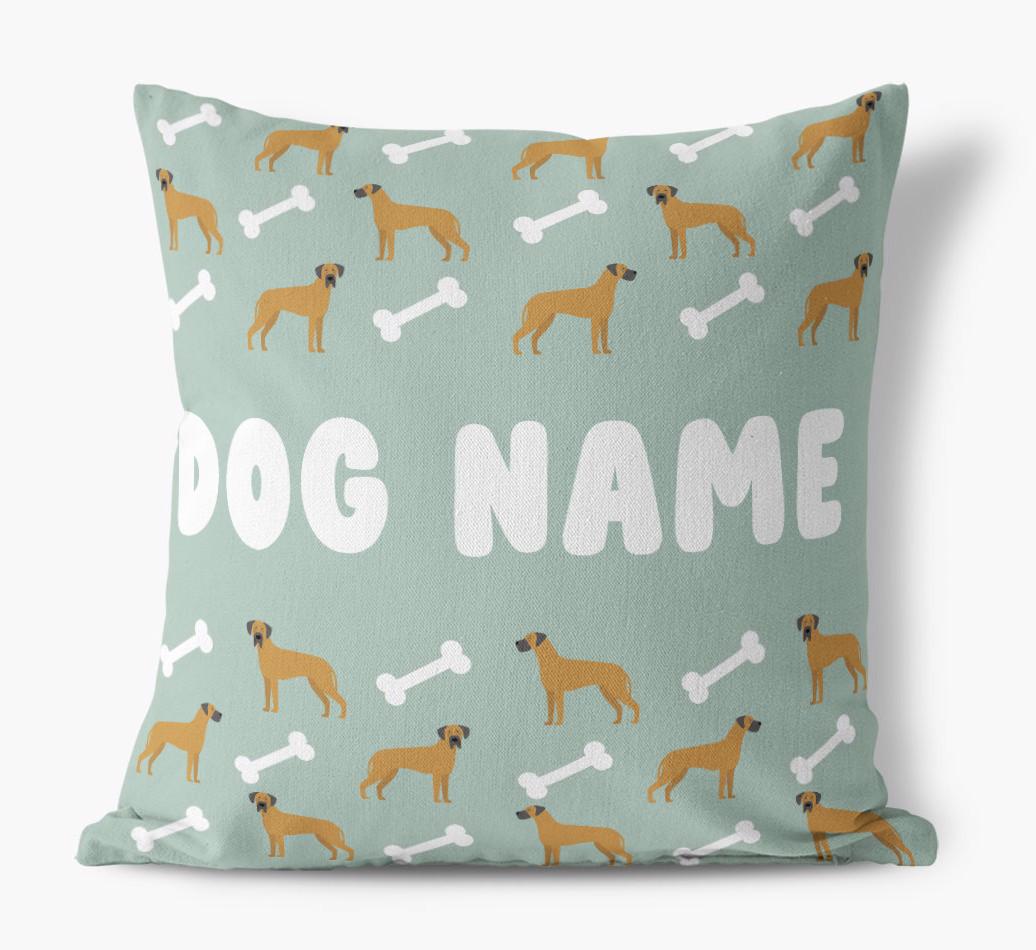 Personalized with Great Dane’s name against a background of Great Dane icons and bones, this gorgeous pillow is full of pawsonality.