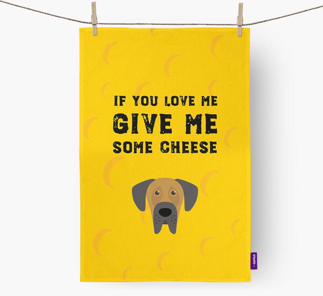 This exclusive Yappy dish towel features a pawsome Great Dane icon upon a cheese themed background and Great Dane's furvorite phrase ‘If you love me, give me some cheese’.