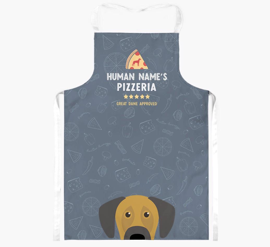 Featuring your furry friend's icon and lick of approval, plus your chosen human name, this apron is pawfect for anyone who considers themselves a pizza maestro in the kitchen. Available in a choice of 5 rustic colors, it'll make any Great Dane lover happy.