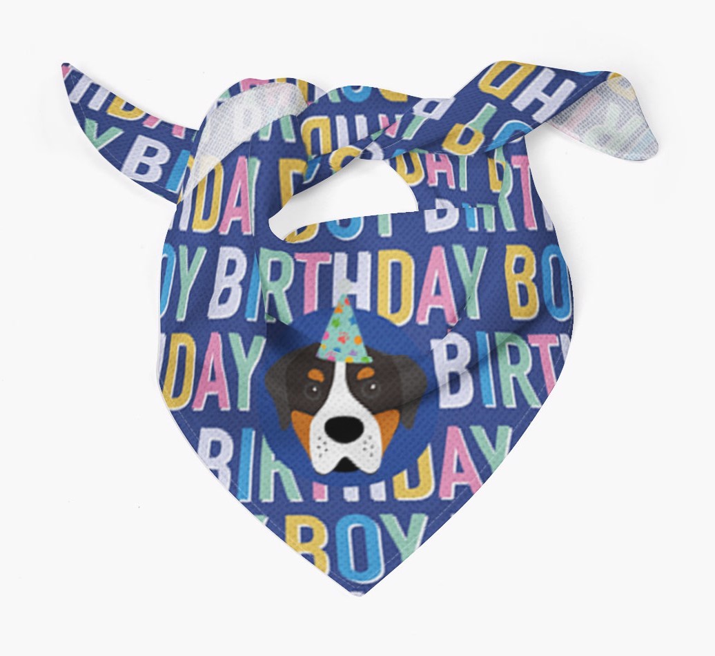 Featuring a colorful text pattern that reads 'birthay boy' and personalized with Greater Swiss Mountain Dog's cute icon (complete with a fun party hat), your Swissy will look simply pawgeous on their special day when they're wearing this bandana.