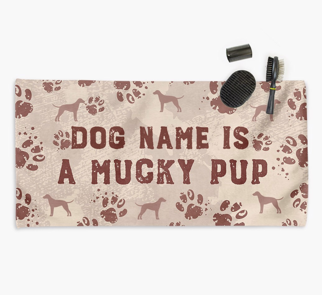 Soft and absorbent, simply wrap your mucky pup in this towel to dry them off in a flash. It features a muddy pawprint pattern and is personalized with Greek Harehound's name and silhouette to make it extra special.