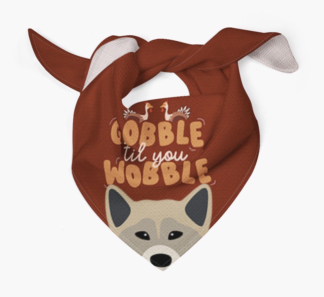 This cute custom bandana is printed with the phrase of the season, "gobble til you wobble"!