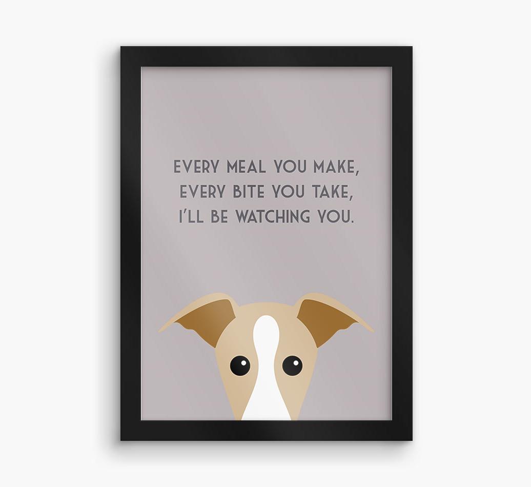 Printed with the words, ‘Every meal you make, every bite you take, I’ll be watching you’ and complete with our cute Greyhound peeking from the bottom of the design, this artwork will look great on display in the kitchen or anywhere Greyhound likes to watch you eat!