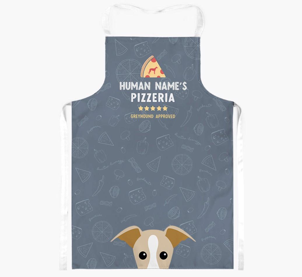 Featuring your furry friend's icon and lick of approval, plus your chosen human name, this apron is pawfect for anyone who considers themselves a pizza maestro in the kitchen. Available in a choice of 5 rustic colors, it'll make any Greyhound lover happy.