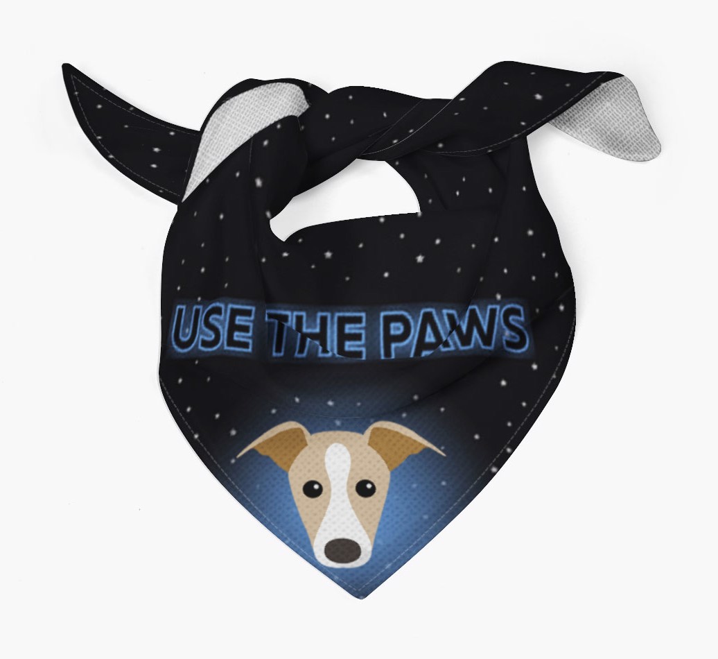 Featuring a starry night sky and glowing text, this bandana is made extra special with the addition of your Greyhound's cute icon.