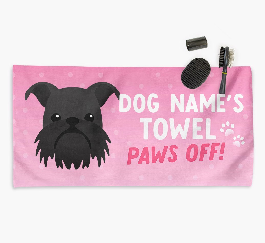 Perfect for messy pups and for pampering your Griffon at bathtime, this soft and absorbent towel is made for cleaning your mucky pup and drying them off in a flash. It's personalized with Griffon Bruxellois's name and icon and is printed with a message for everyone else to keep their paws off it!