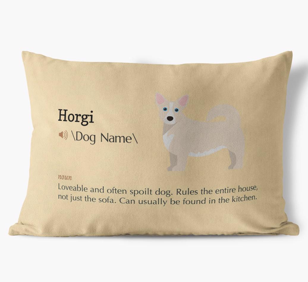 Personalized just for Your Horgi and featuring a unique Horgi definition and silhouette, this pillow truly is like no other.
