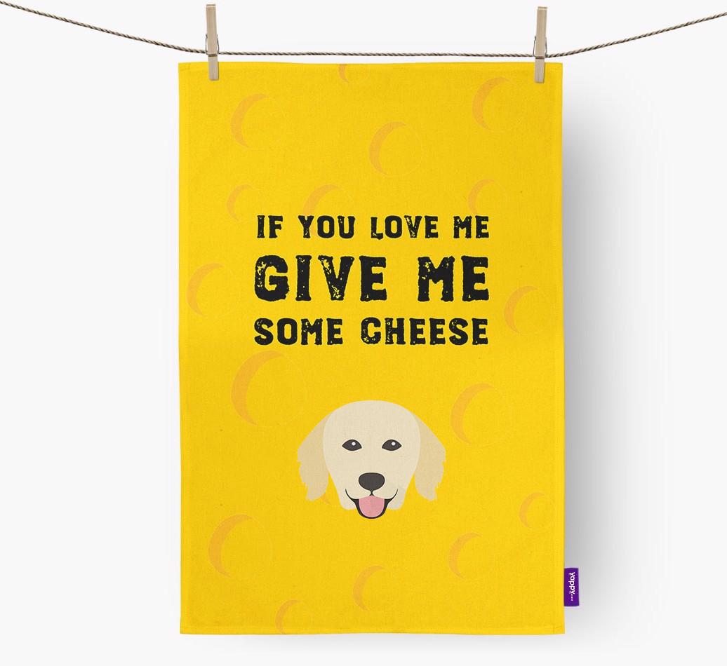 This exclusive Yappy dish towel features a pawsome Hovawart icon upon a cheese themed background and Hovawart's furvorite phrase ‘If you love me, give me some cheese’.
