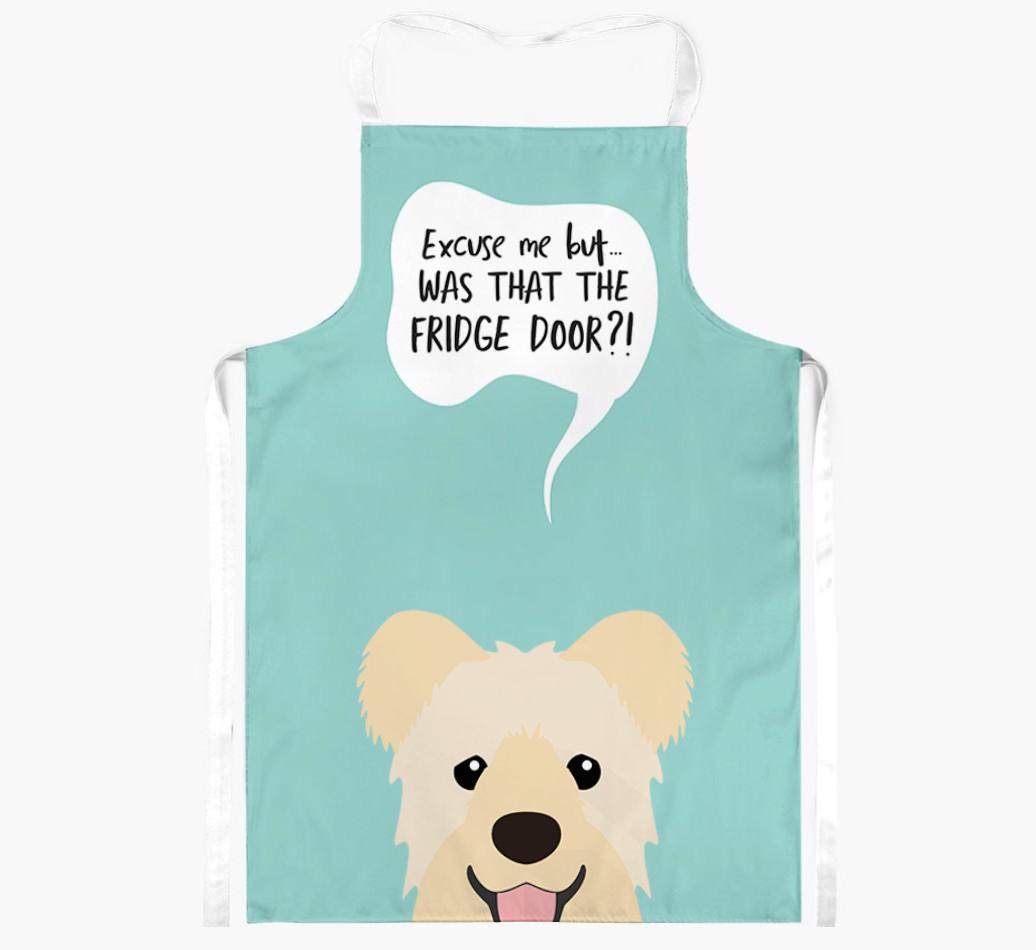 Featuring your hungry hound's cheeky icon and available in five eye-catching colors, this apron is a must-have for parents of greedy pups!