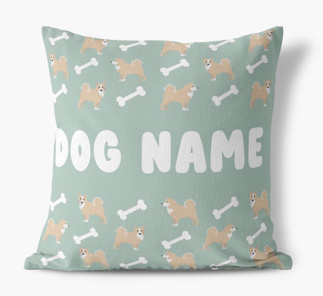 Personalized with Icelandic Sheepdog’s name against a background of Icelandic Spitz icons and bones, this gorgeous pillow is full of pawsonality.