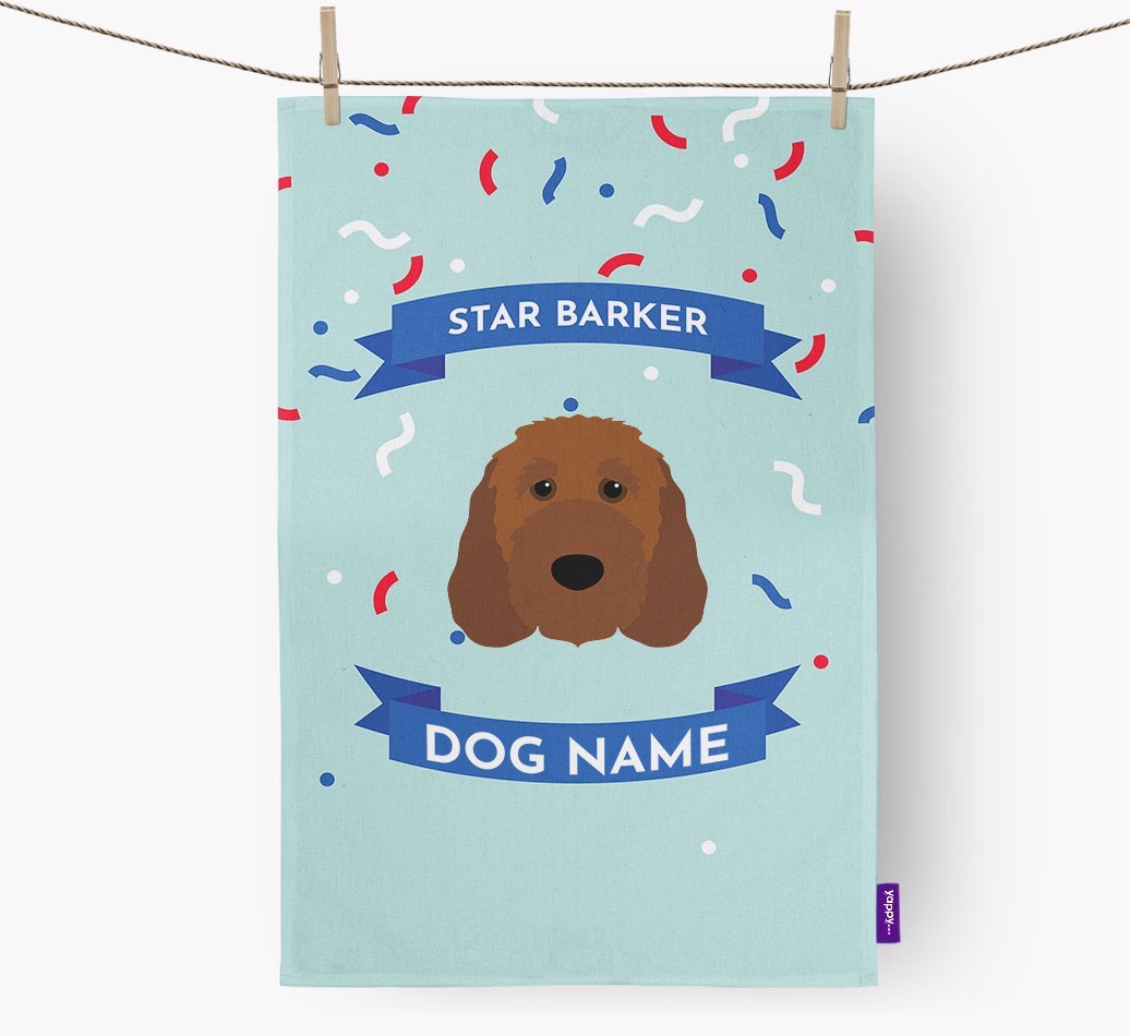 Now you can make sure your Irish Doodle’s new title is seen by everyone with this pawsome ‘Star Barker’ dish towel, pawsonalized especially for Irish Doodle.