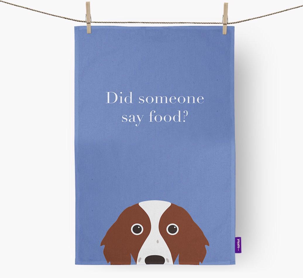 Printed with the question, ‘Did someone say food?’, this dish towel knows exactly what’s on Your Red & White Setter’s mind.