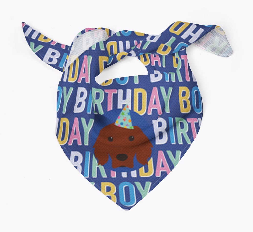 Featuring a colorful text pattern that reads 'birthay boy' and personalized with Irish Setter's cute icon (complete with a fun party hat), your Red Setter will look simply pawgeous on their special day when they're wearing this bandana.