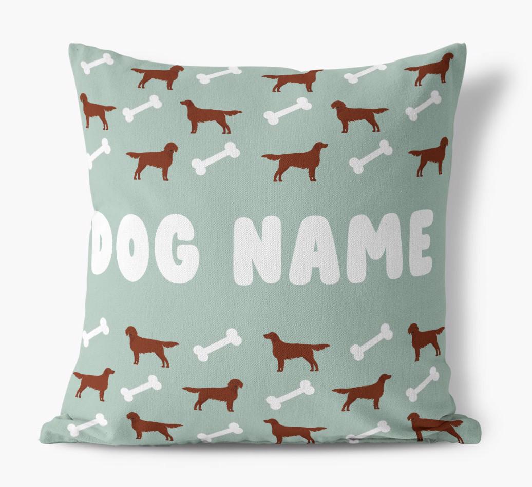 Personalized with Irish Setter’s name against a background of Red Setter icons and bones, this gorgeous pillow is full of pawsonality.