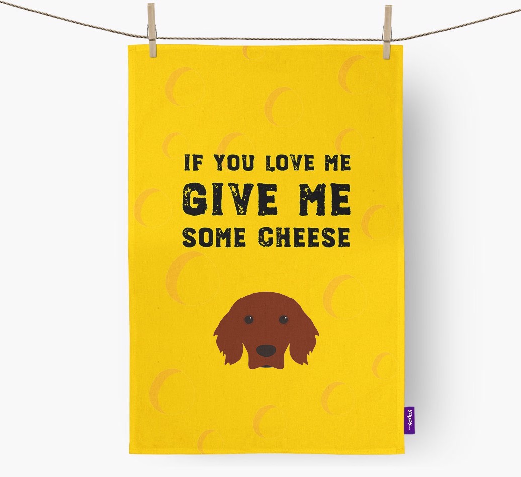 This exclusive Yappy dish towel features a pawsome Irish Setter icon upon a cheese themed background and Irish Setter's furvorite phrase ‘If you love me, give me some cheese’.