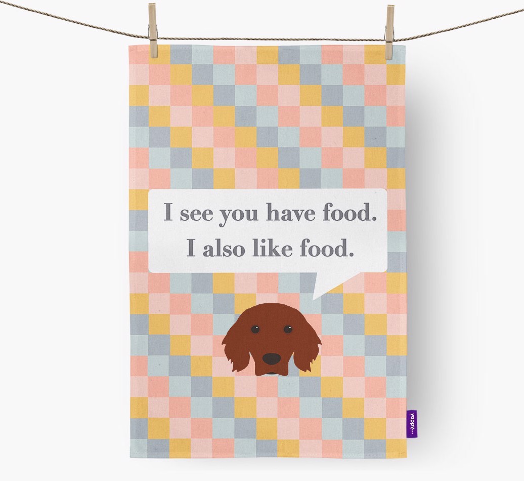 If your Irish Setter is a full time snack machine, this dish towel may be the ideal way to warn your guests.