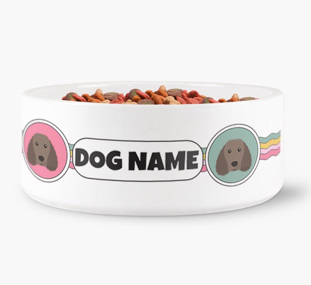 This jazzy dog bowl is sure to make waves with Irish Water Spaniel! With a colorful wavy pattern, this bowl is personalized with adorable Water Spaniel icons and Irish Water Spaniel’s name to make it extra special.