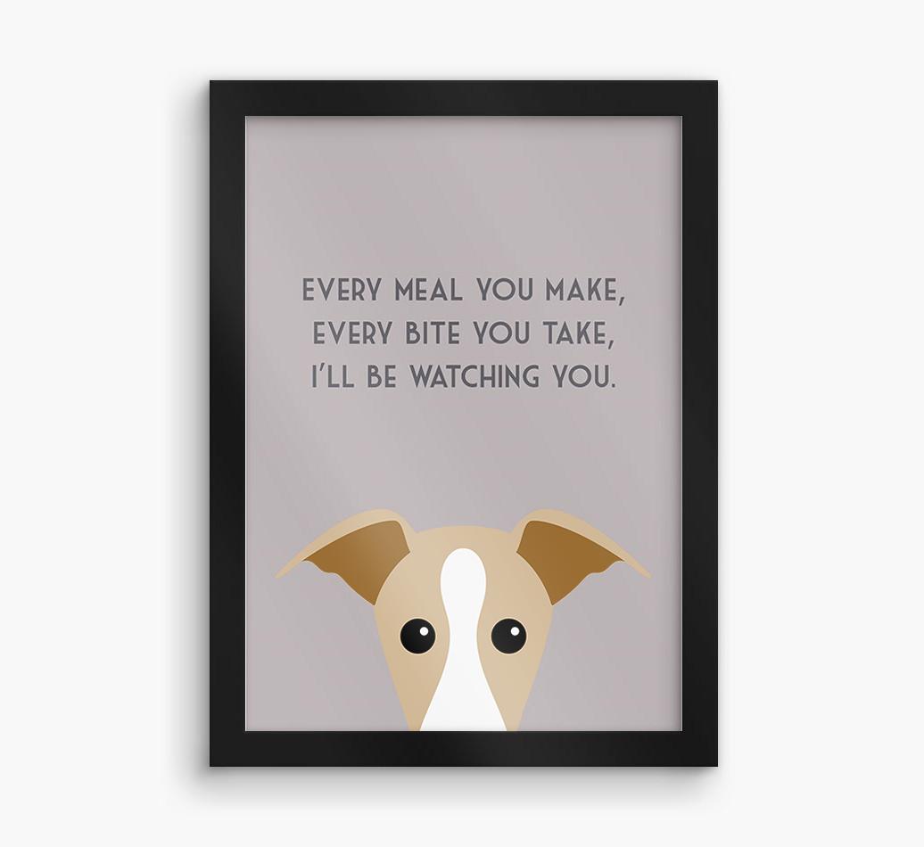 Printed with the words, ‘Every meal you make, every bite you take, I’ll be watching you’ and complete with our cute Iggy peeking from the bottom of the design, this artwork will look great on display in the kitchen or anywhere Italian Greyhound likes to watch you eat!