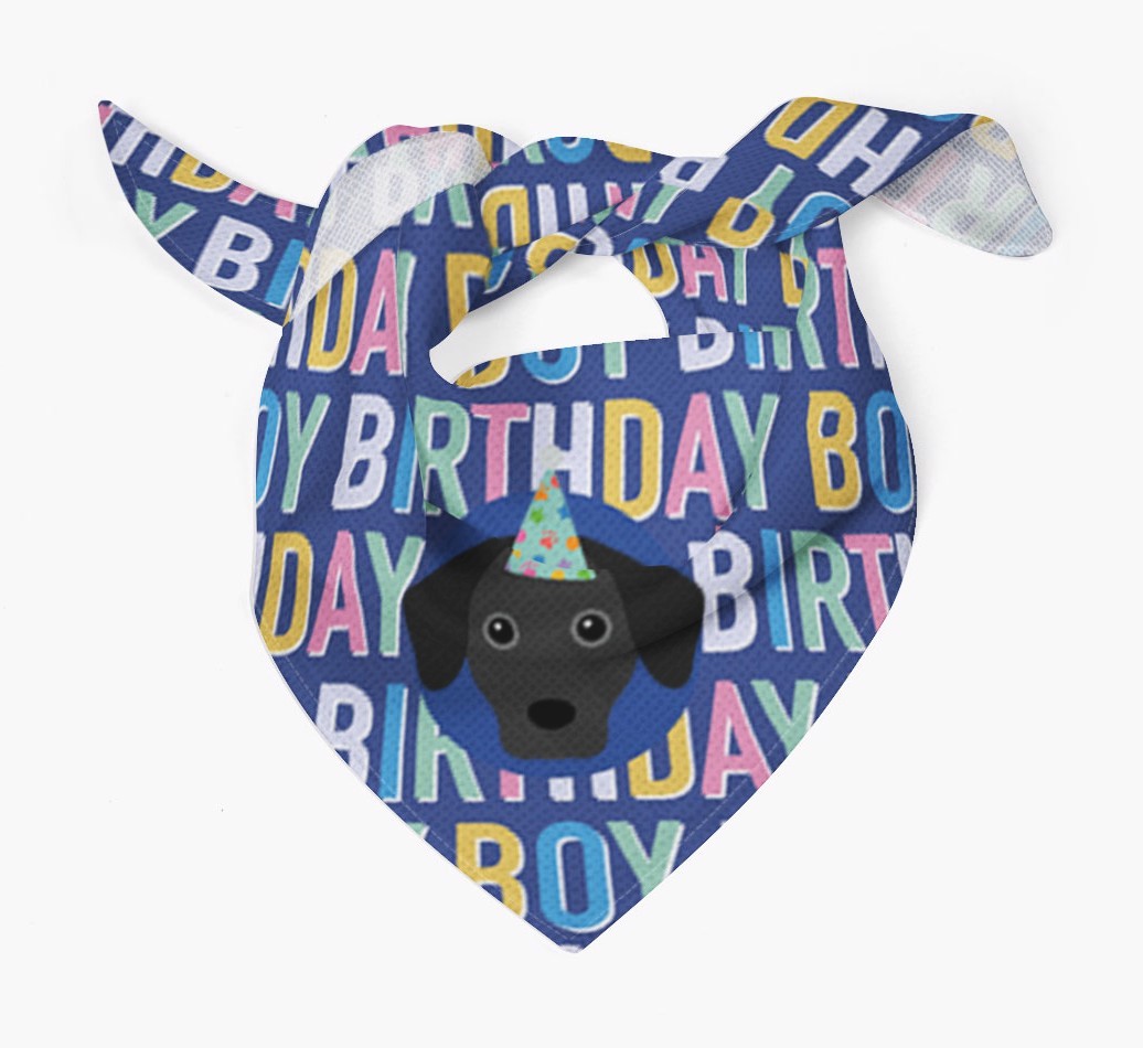 Featuring a colorful text pattern that reads 'birthay boy' and personalized with Jack-A-Bee's cute icon (complete with a fun party hat), your Jack-A-Bee will look simply pawgeous on their special day when they're wearing this bandana.