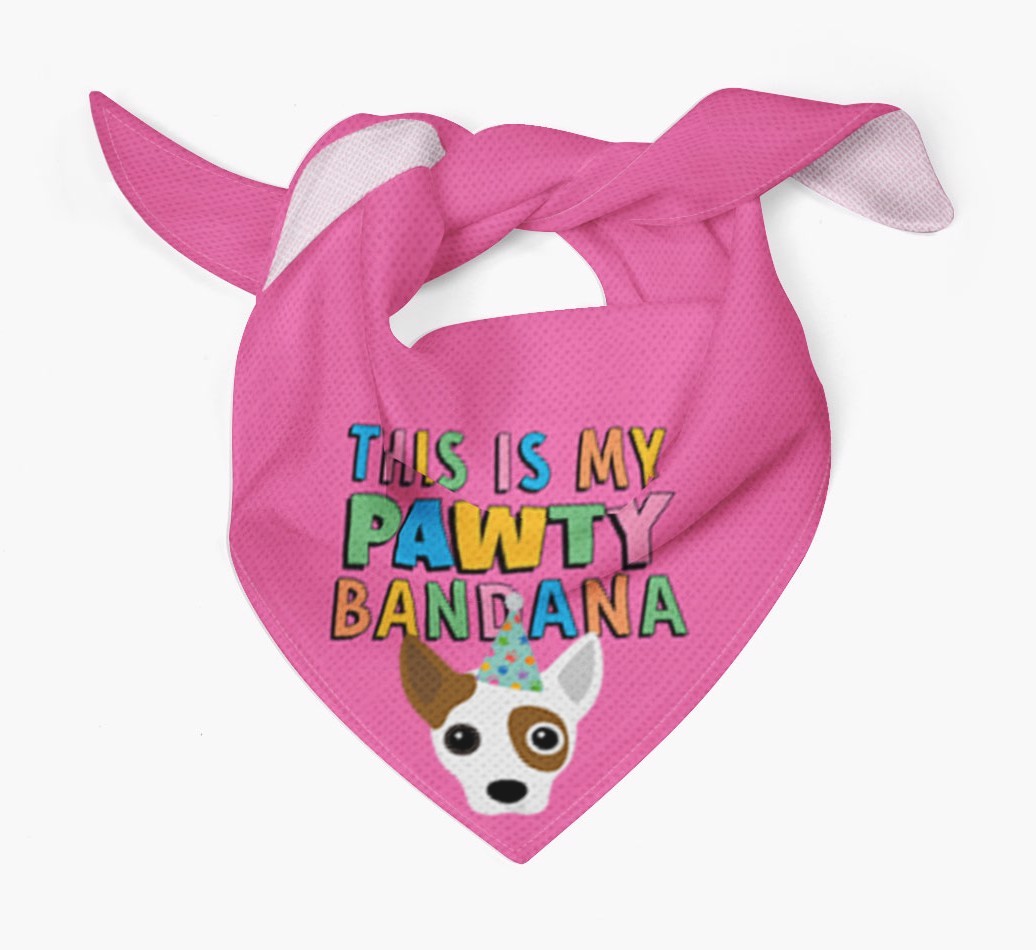 Featuring a colorful text pattern that reads 'this is my pawty bandana' and personalized with your Jack Chi's icon, this vibrant bandana is a fun way for your pup to dress up and get pawty ready in no time.