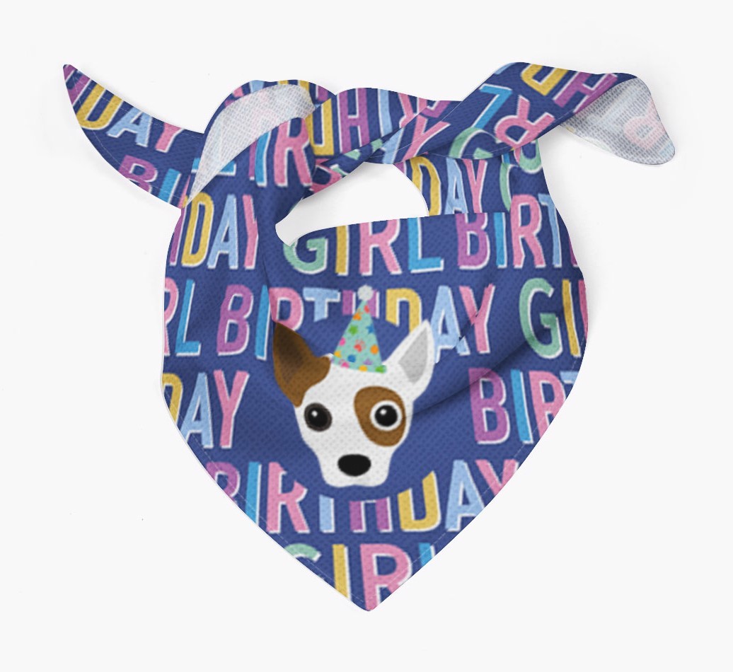 Featuring a text pattern that reads 'birthay girl' and personalized with Jackahuahua's cute icon (complete with a fun party hat), your Jack Chi will look simply pawgeous on their special day when they're wearing this bandana.