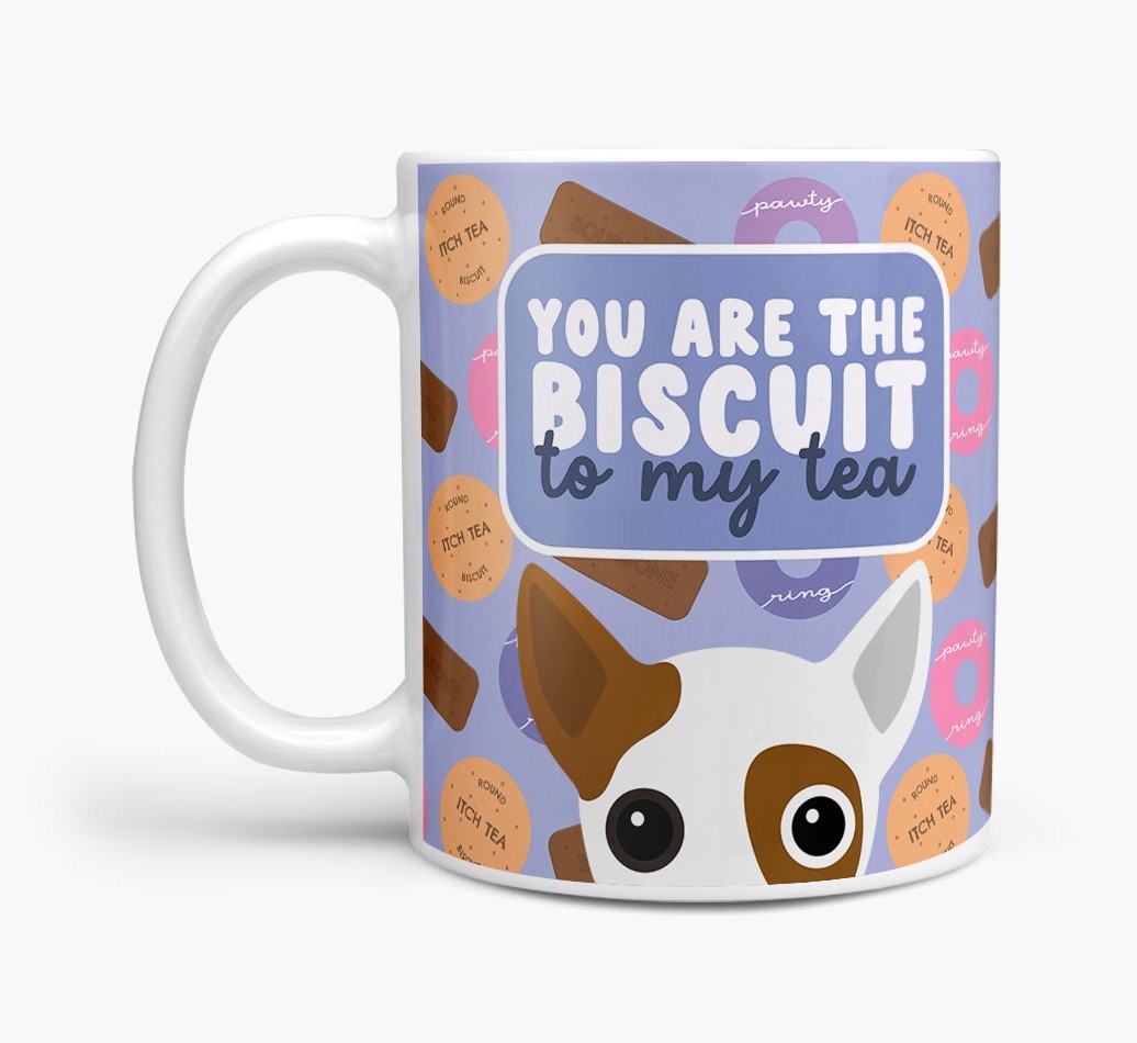 Featuring a cute biscuit motif paired with your Jack Chi's adorable face, this mug is bound to be a firm favorite in every household.