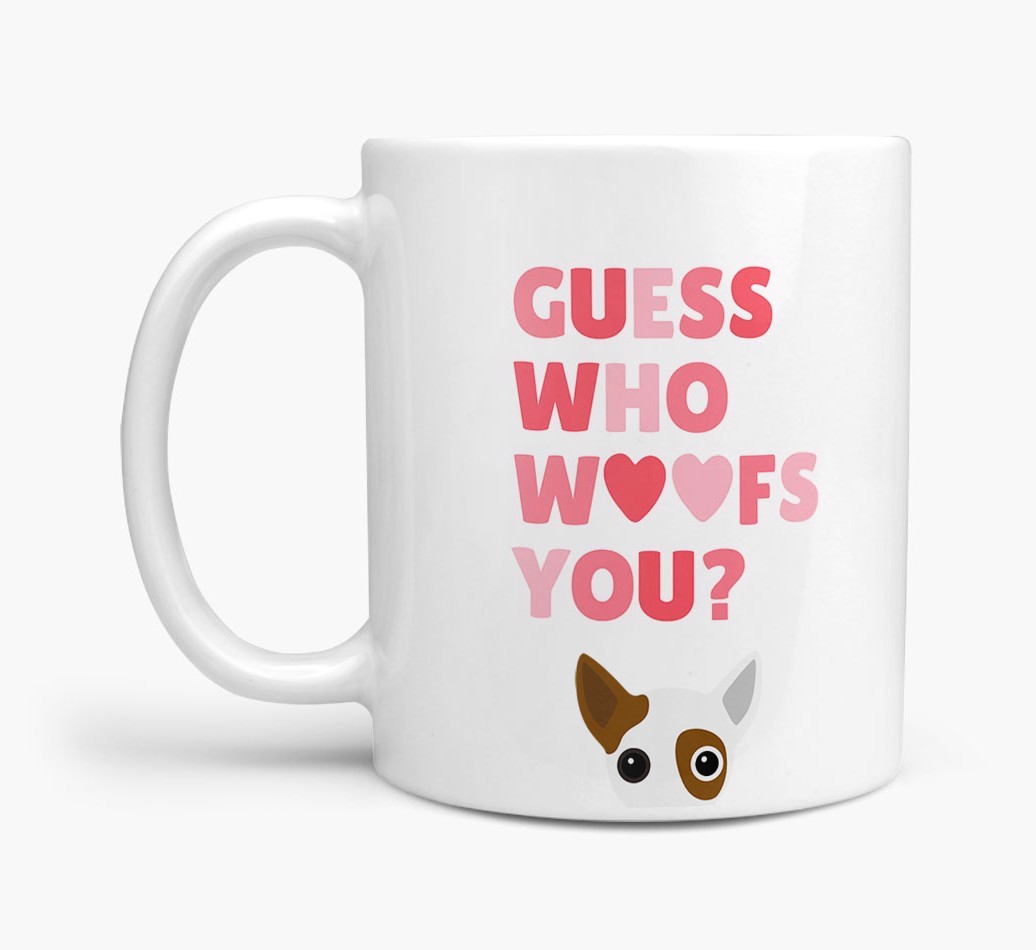 Personalized with Jackahuahua's cute face, this adorable mug is perfect for showing off the one who "woofs" you - how sweet!