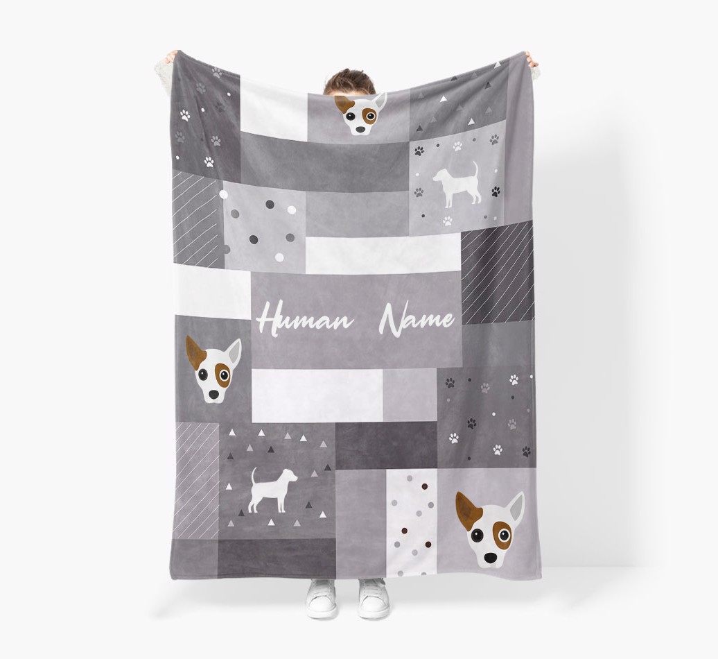 Wagnificently homely, this super soft blanket features a patchwork design, which includes your Jack Chi's adorable icon, as well as your name too!