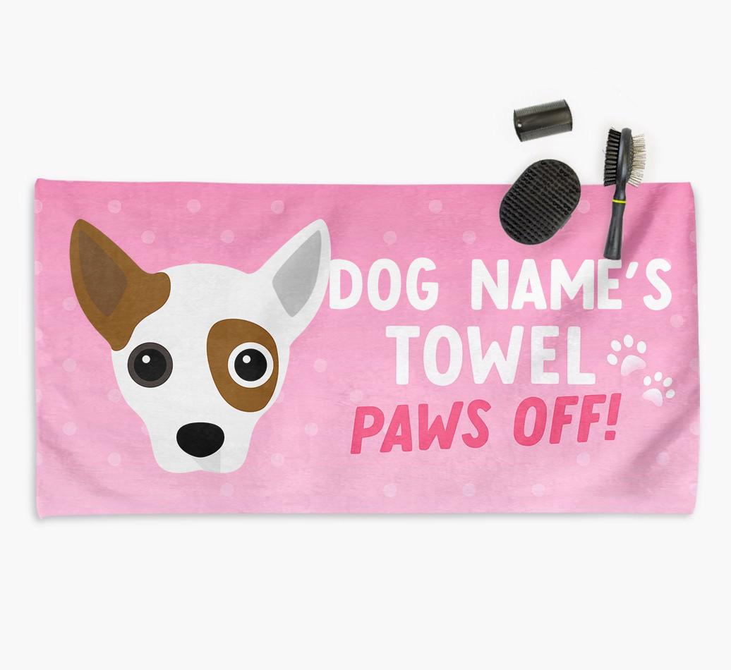 Perfect for messy pups and for pampering your Jack Chi at bathtime, this soft and absorbent towel is made for cleaning your mucky pup and drying them off in a flash. It's personalized with Jackahuahua's name and icon and is printed with a message for everyone else to keep their paws off it!