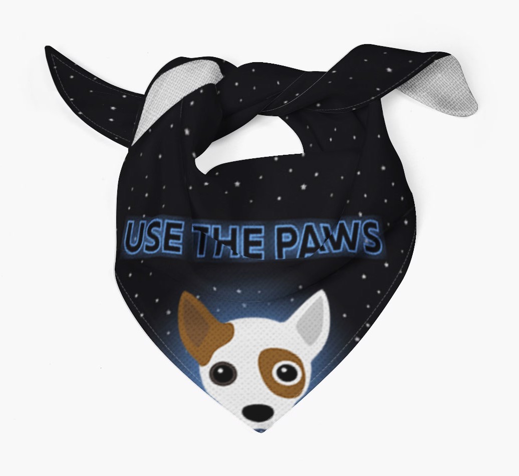 Featuring a starry night sky and glowing text, this bandana is made extra special with the addition of your Jack Chi's cute icon.