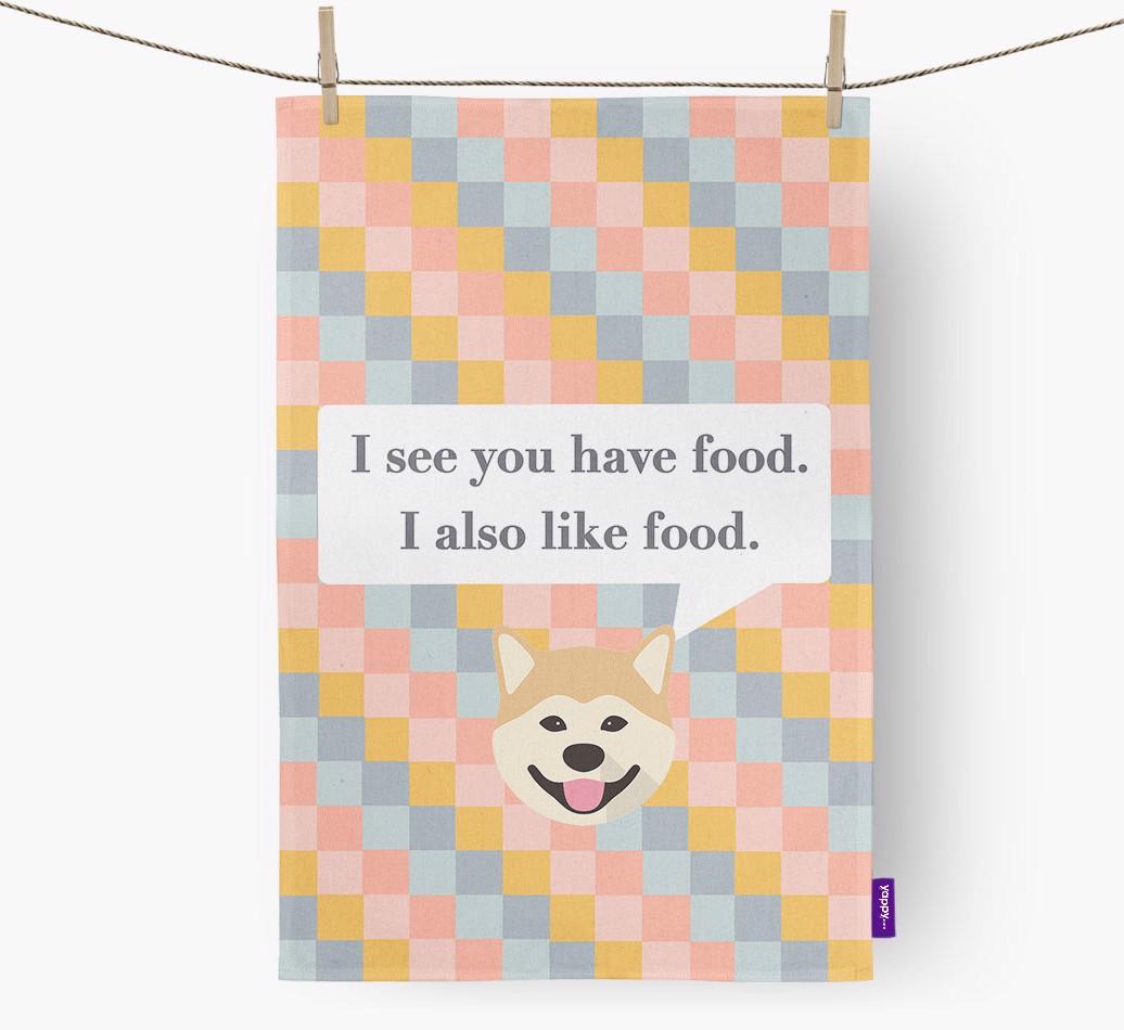If your Japanese Akita is a full time snack machine, this dish towel may be the ideal way to warn your guests.