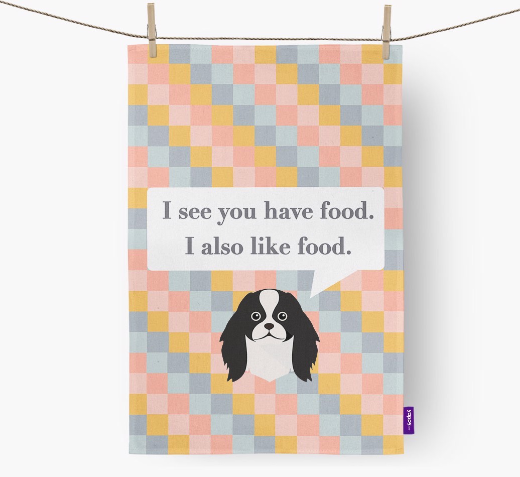 If your Japanese Chin is a full time snack machine, this dish towel may be the ideal way to warn your guests.