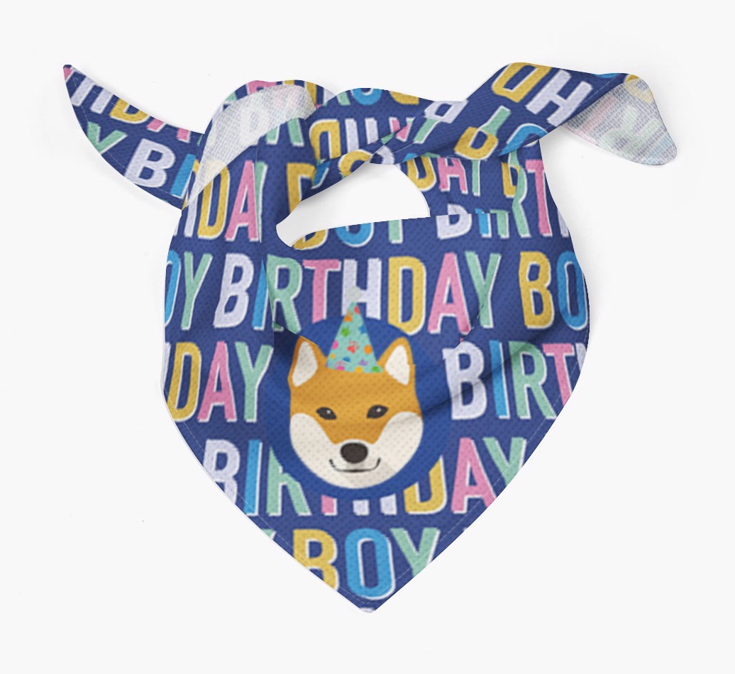 Featuring a colorful text pattern that reads 'birthay boy' and personalized with Japanese Shiba's cute icon (complete with a fun party hat), your Shiba Inu will look simply pawgeous on their special day when they're wearing this bandana.