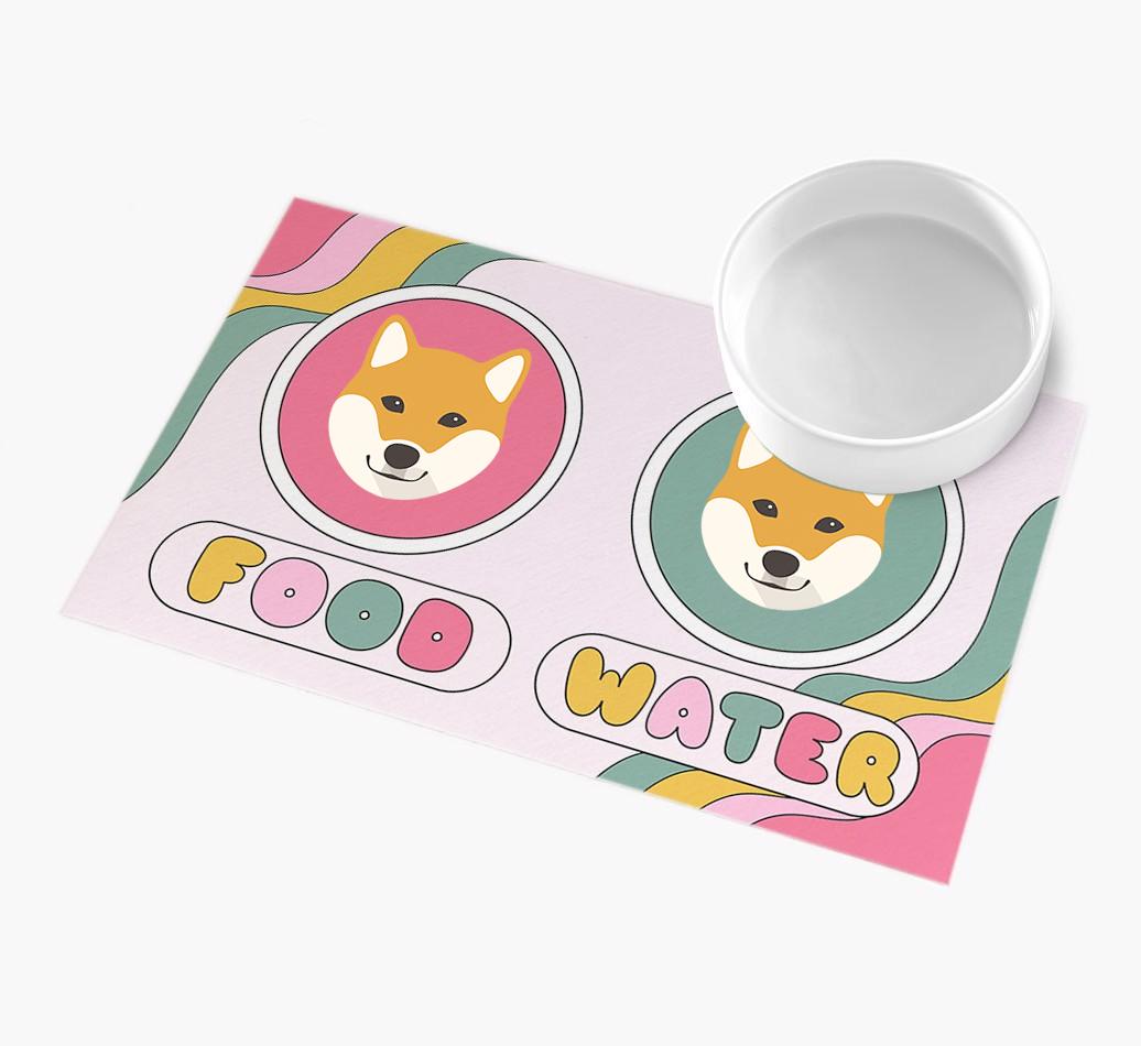 With a swirl of pastel colors and the addition of cute Japanese Shiba icons, this feeding mat is a stylish place to sit Japanese Shiba’s food and water bowls!