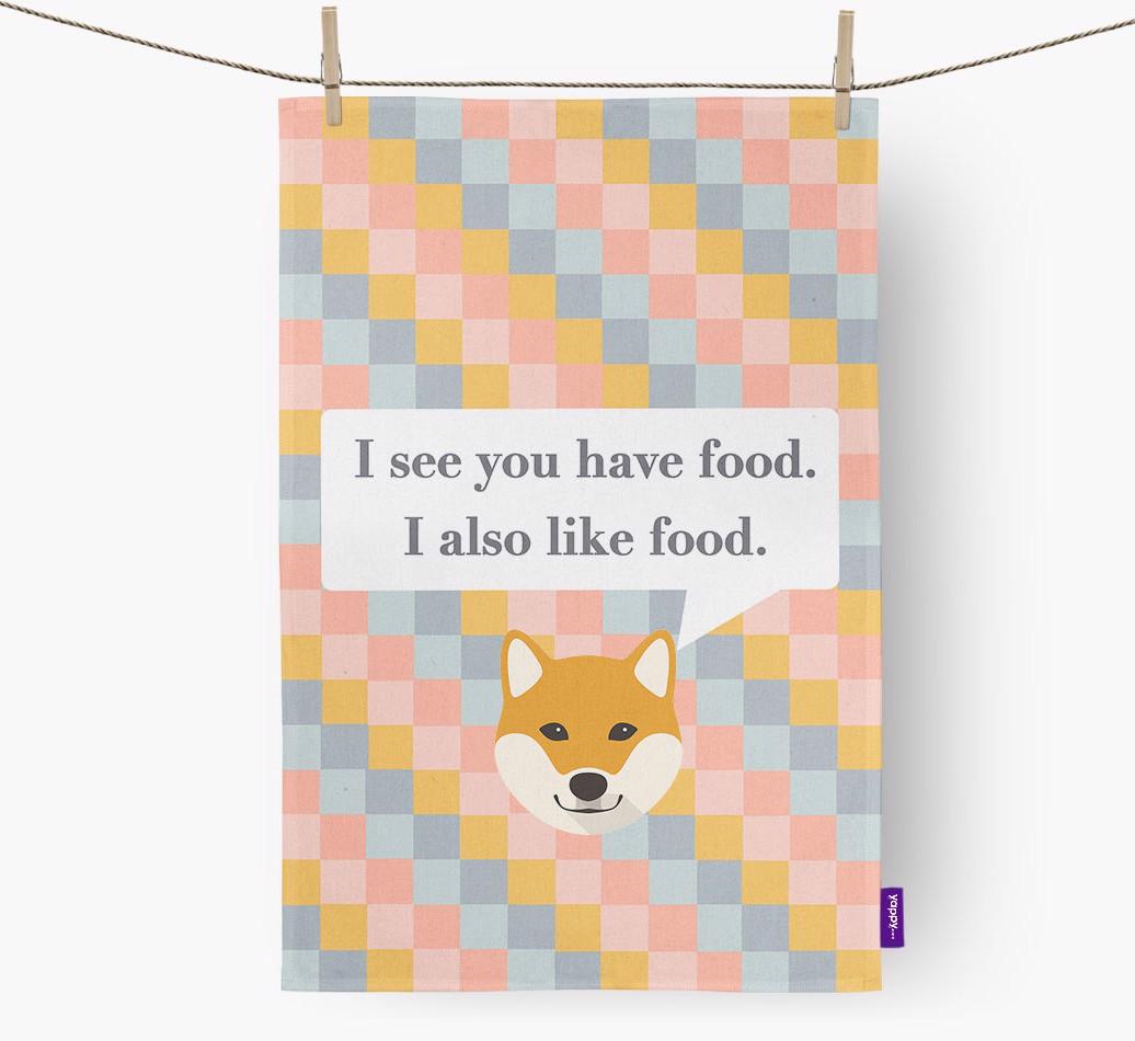 If your Japanese Shiba is a full time snack machine, this dish towel may be the ideal way to warn your guests.
