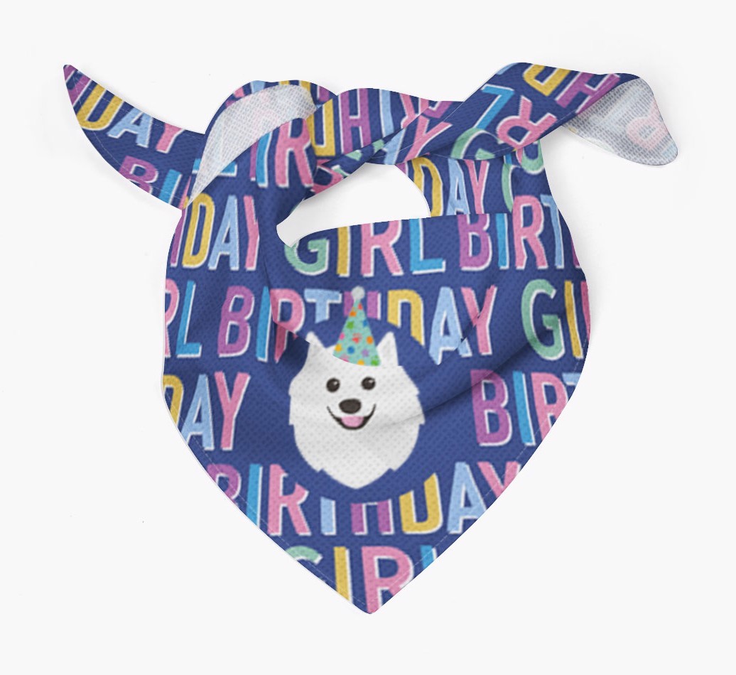 Featuring a text pattern that reads 'birthay girl' and personalized with Japanese Spitz's cute icon (complete with a fun party hat), your Spitz will look simply pawgeous on their special day when they're wearing this bandana.