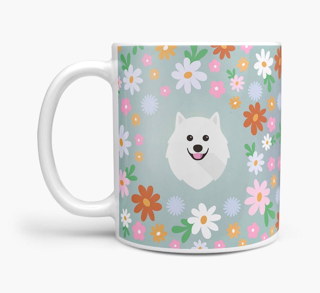 Featuring a colorful bunch of flowers, this mug is printed with the words 'woofly grandma' on one side of the mug and your Spitz's cute icon on the other. Bloomin' lovely!