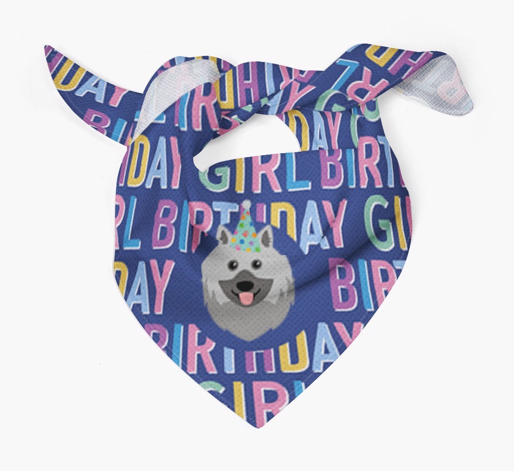 Featuring a text pattern that reads 'birthay girl' and personalized with Keeshond's cute icon (complete with a fun party hat), your Keeshond will look simply pawgeous on their special day when they're wearing this bandana.